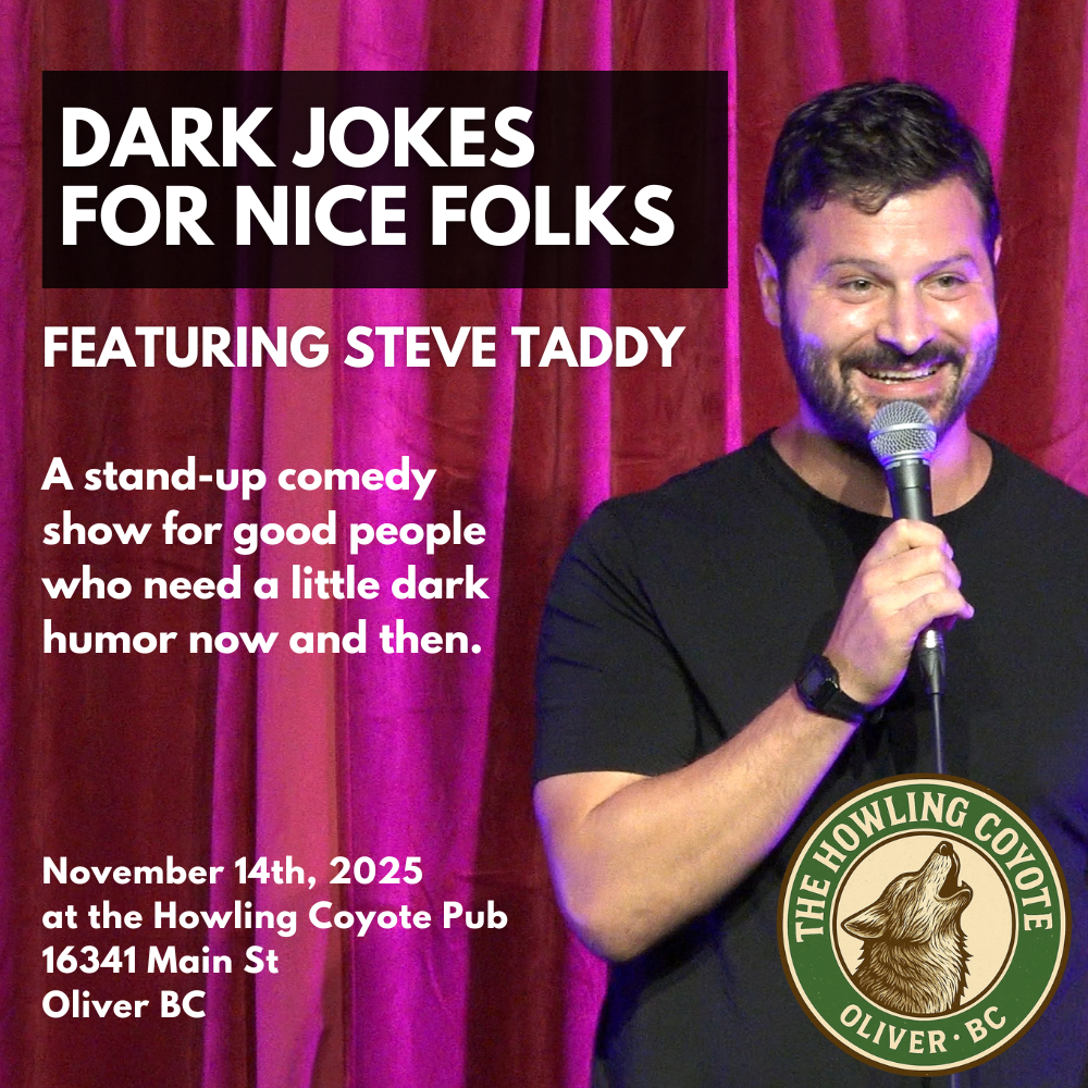 ![November 14: “Dark Jokes for Nice Folks” Stand-up Comedy at the Howling Coyote Pub (Oliver) - Featuring Steve Taddy [Tickets]](http://stevetaddycomedy.com/cdn/shop/files/November14OliverHowlingCoyotePub_2.png?v=1757608298&width=1445)